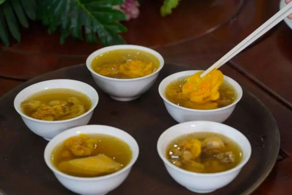 Khi nấu canh có thể cho một gói trà túi lọc hoặc thêm 1-2 bông hoa trà khô. Vì vậy, trà hoa vàng không chỉ có thể pha làm trà để uống mà còn là một dược liệu quý. Hoa luộc có thể kết hợp với yến sào, nhân sâm, đông trùng hạ thảo, nấm linh chi,… để nấu súp nhằm tận dụng tối đa hơn 400 loại dưỡng chất.
