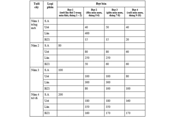 Người ta thường tính toán lượng lân cần sử dụng dựa theo tuổi cây. Còn thời điểm dựa vào thời gian của mùa mưa trong năm.
