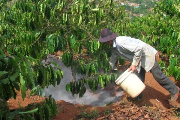 Qua giai đoạn bón phân lót cho cây mới trồng, cần tiến hành tiếp tục bổ sung dinh dưỡng cho cây cà phê con phát triển.