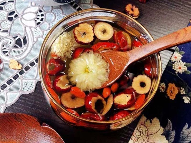 Thực hiện pha trà hoa cúc kỷ tử táo đỏ: