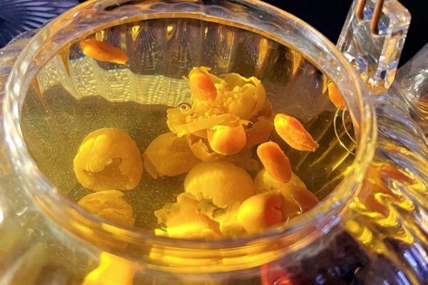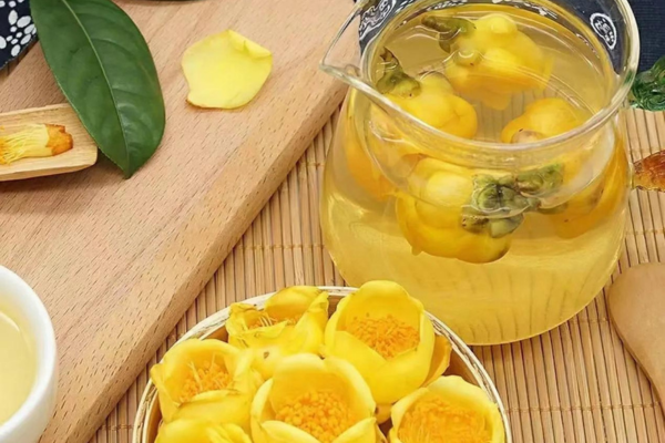 Dùng trà hoa vàng kết hợp với các món ăn. Có rất nhiều các món ăn được kết hợp với trà hoa vàng như các món hầm, hoặc đồ ngọt như các món chè. Đặc biệt, khi cần bồi bổ sức khỏe, người ta thường hầm gà với các bông hoa trà và nhân sâm.